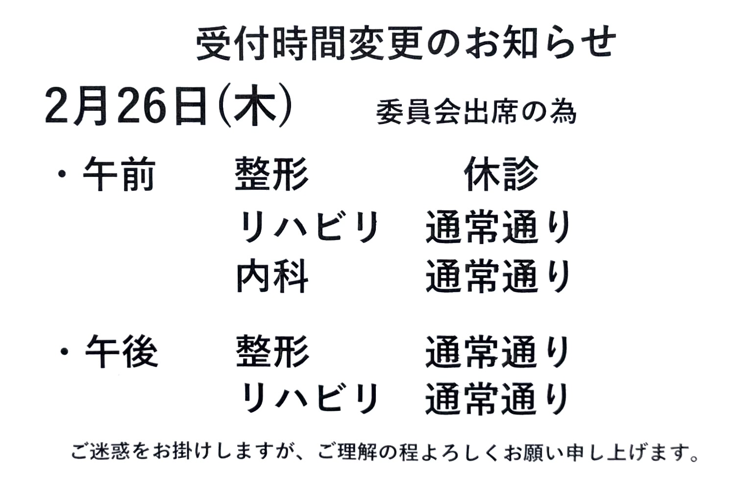 2月26日(木) 委員会出席の為、整形外科は午前休診とさせていただきます。 内科外来・リハビリテーションは通常通り行っております。御迷惑をおかけいたしますが、ご理解のほどよろしくお願い申し上げます。